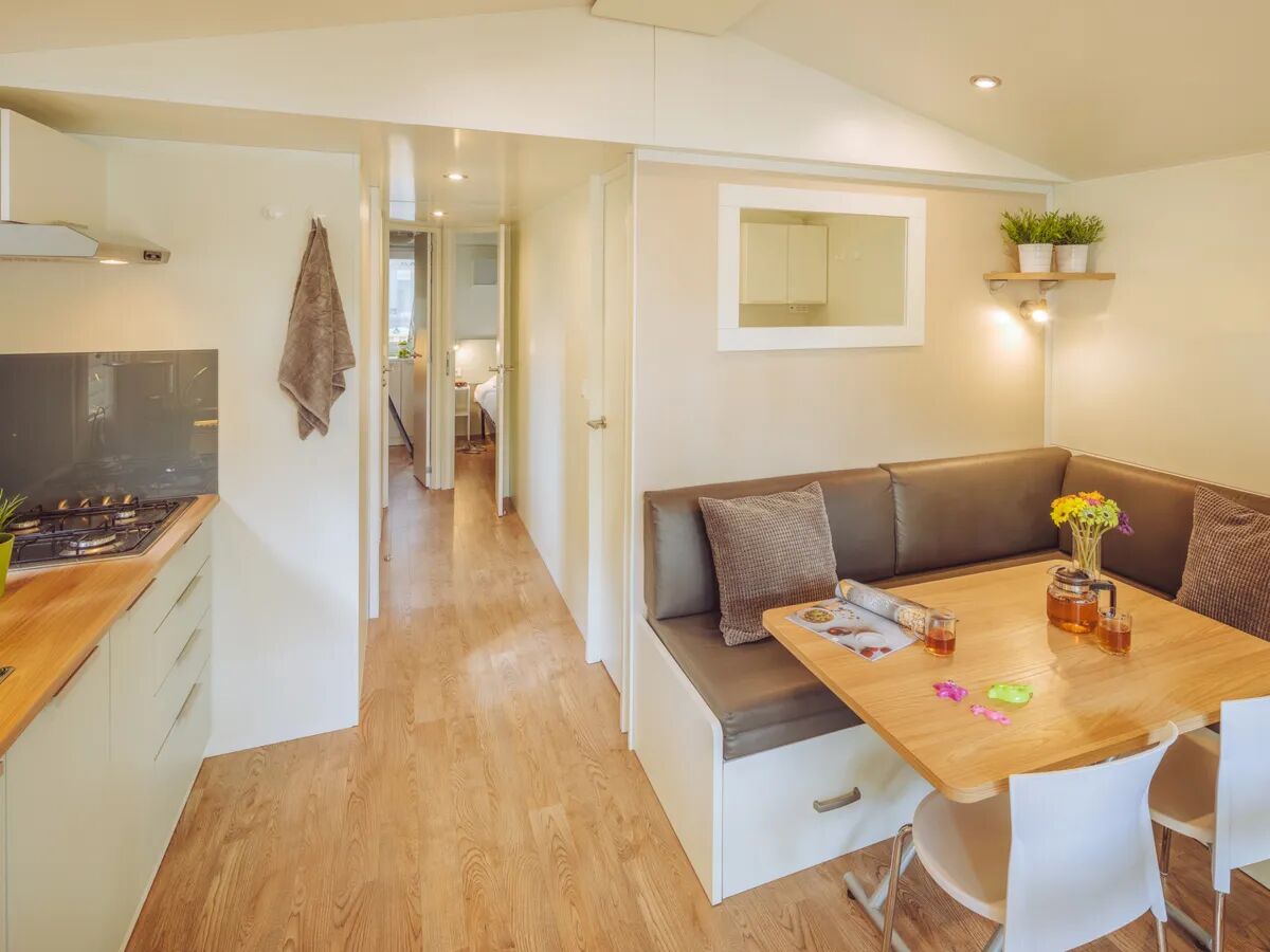 Nel soggiorno spazioso con aria condizionata troverete una zona giorno e una zona cucina. La cucina è dotata di un frigorifero alto con congelatore separato, forno a microonde, bollitore, un fornello a gas a 4 fuochi, lavastoviglie e Nespresso Macchina caffè. In molti campeggi potrete prenotare una casa mobile con lavastoviglie. Il soggiorno ha una televisione satellitare con tutti i principali canali esteri (canali Italiani non inclusi). Il bagno ha una spaziosa cabina doccia e lavandino con grande specchio, mentre Il wc è stato posizionato separatamente dal resto della zona bagno.