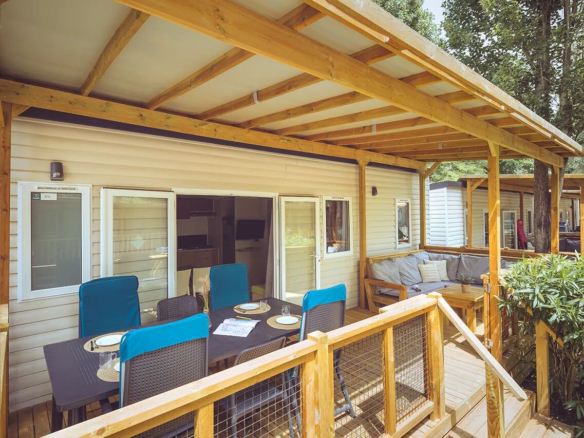 La veranda è lunga 7,5 metri e profonda 2,5 metri e si chiude completamente con un cancelletto. La veranda è coperta o semi coperta con un lussuoso ombrellone o telo ombreggiante. Sulla pagina del campeggio trovate il tipo di veranda, se coperta o semi coperta con un lussuoso ombrellone o telo ombreggiante. Il lussuoso set da giardino è composto da 4 sedie reclinabili con cuscini, 3 sedie impilabili ed un lussuoso lettino da spiaggia. Questa cucina all'aperto è dotata di piastra, acqua corrente e molto spazio per riporre le cose.