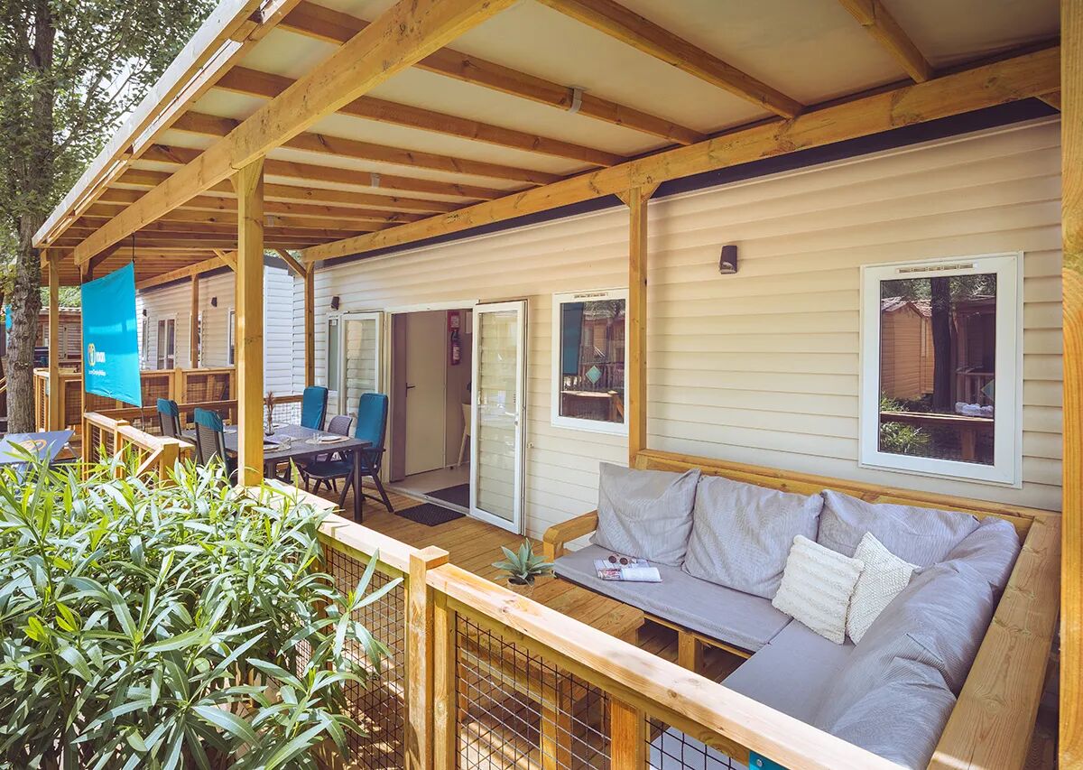 Un altro vantaggio di questa casa mobile Premium Lounge è l'ampia veranda coperta che permette di sedersi sempre all'aperto. La veranda è dotata di un parasole Roan contro il sole basso e per una maggiore privacy e di moderni mobili da giardino. Sulla pagina del campeggio, potete leggere quale piastra barbecue/griglia gratuita ha il vostro alloggio.