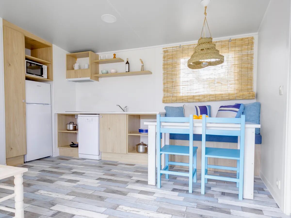 Airco SAT-TV Lavastoviglie Lino incl. 2 bagni Premium ZoneLa casa mobile Premium con due camere da letto si trova in una splendida zona paesaggistica, priva di auto, fiancheggiata da palme e dotata di una terrazza in legno. La terrazza in legno è ricoperta di bambù e dotata di raffinati mobili da giardino. Queste case mobili di lusso includono lenzuola e asciugamani da doccia gratuiti. E lo sapevi che puoi anche aggiungere la pensione completa, la mezza pensione o la colazione alla tua prenotazione? Che lusso!