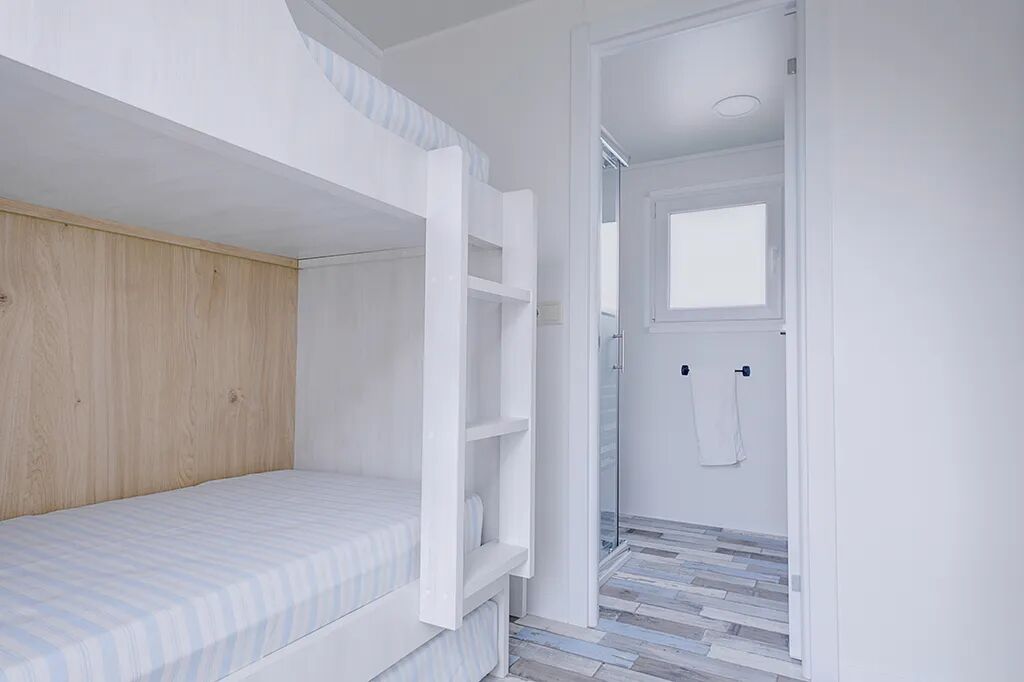 Questa lussuosa casa mobile dispone di 2 camere da letto. La camera da letto principale ha un letto matrimoniale e la seconda camera da letto ha un letto a castello (peso massimo 70 kg) con un letto estraibile supplementare. Ogni casa mobile è dotata di 1 porta-letto di serie.