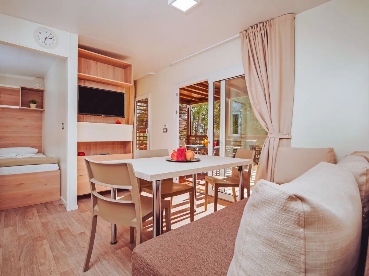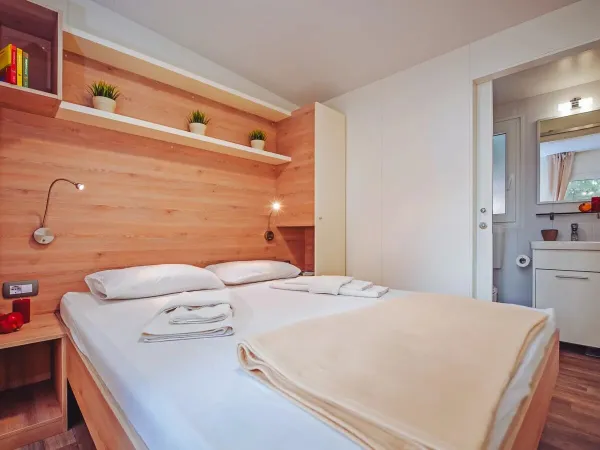 La casa mobile Premium dispone di 2 camere da letto: una con letto matrimoniale e la camera dei bambini con 2 letti singoli. Anche il divano del soggiorno può essere trasformato in un letto. Di serie viene fornito un porta-letto, da far scorrere sotto il materasso per evitare che il bambino si alzi dal letto.