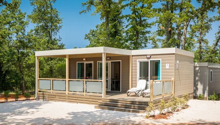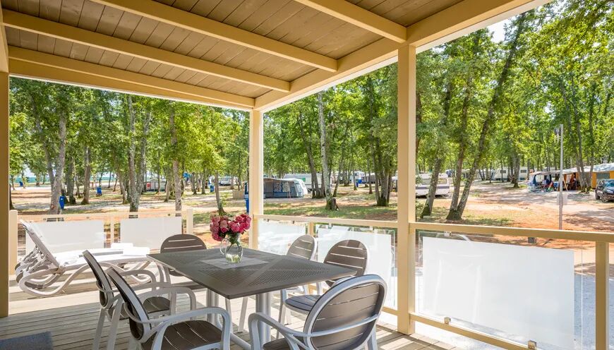 Un altro vantaggio di questa casa mobile Premium è la grande veranda coperta a tre quarti di 26 m2, per rilassarsi all'aperto quanto più possibile. l'Arredamento da giardino elegante è composto da un tavolo grande, 6 sedie impilabili e 2 lettini. Sulla pagina del campeggio, potete leggere quale piastra barbecue/griglia gratuita ha il vostro alloggio.