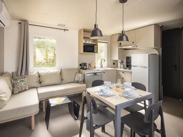 Dalla veranda si accede direttamente all'accogliente soggiorno e alla cucina. Il soggiorno è arredato con stile e ben attrezzato. Nella casa mobile ci sono divertenti giochi (da tavolo) per tutta la famiglia e una cassa acustica con luce incorporata per ascoltare la vostra musica preferita. Potrete rilassarvi sul comodo divano e sulla TV satellitare potrete godervi quasi tutti i canali televisivi che potete guardare a casa vostra! La TV satellitare dispone anche di una porta USB per la riproduzione di file MPEG4. La cucina è spaziosa e ha un inventario molto completo! Include una lavastoviglie, un frigorifero alto con scomparto congelatore separato, una macchina da caffè Nespresso, un microonde e un bollitore. C'è 1 bagno con una spaziosa cabina doccia e un lavabo con acqua calda. L'altro bagno, adiacente a una delle camere matrimoniali, è dotato di una spaziosa cabina doccia e di un lavandino con acqua calda. Per un comfort ancora maggiore, sono presenti 2 servizi igienici separati.